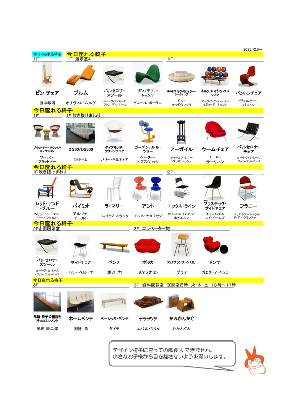 館内はまさに「椅子の美術館」。開館当初から近代以降の優れたデザインの椅子を収集し、常時数種類を館内に展示しています。