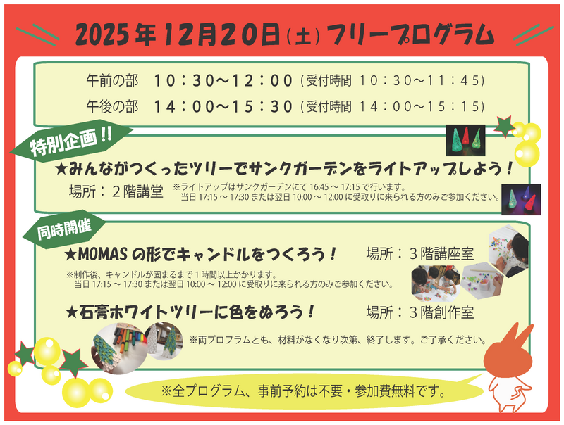 2025年12月20日「フリープログラム」は事前申込み不要です。開催時間・内容をご確認ください。