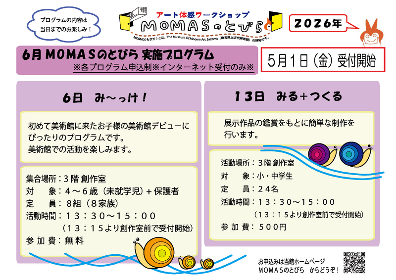 6月のMOMASのとびら「み~っけ!」「みる+つくる」の申込み受付開始が5月1日を予定しています。