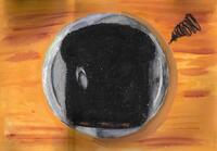 課題作品を見たときにまず虚無感を感じて、その後よく見ると立ってる人が真っ黒ではじがちりちりしていたのでなにかが燃えて、真ん中に立っている人以外全て燃えてなくなってしまって、真ん中に立っている人もかろうじて形は保っているが炎によってこげてしまったんじゃないかなと考えました。また手に持っているシンバルを銀のお皿として使いました。