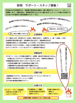 埼玉県立近代美術館では、美術館の教育普及活動を一緒に運営する「サポート・スタッフ」を募集します。